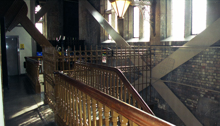 dem Aufzug hinauf und steigt dann noch ein paar Treppen hoch.